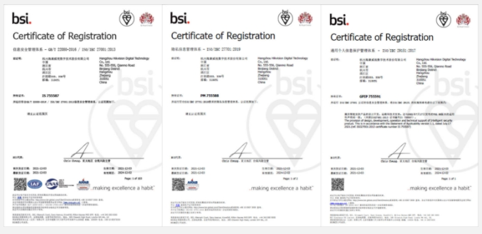 近日,海康威視正式獲得由國際**標準研發和認證評審機構英國標準協會(BSI)頒發的ISO/IEC 27701:2019及ISO/IEC 29151:2017體系認證,意味著海康威視所建立的隱私信息管理···